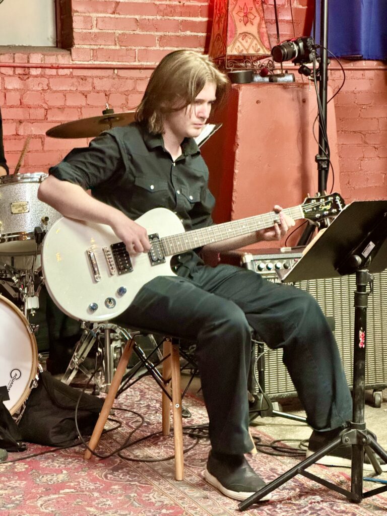 アートフェスティバル会場(九電EVスクエア)にて海老原靖さんの作品前で夢色出演アーティストがクラシックギターを奏でます。